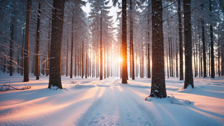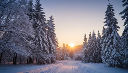 A tranquil winter scene with a snow-covered forest path leading towards a vibrant sunrise, casting warm light through snow-laden evergreen trees.