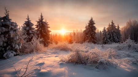Winter sunset in a winter wonderland landscape with plenty of snow and snow covered trees. Generative AI illustrator