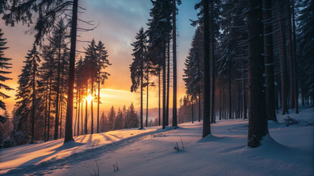 A snow-covered forest path leads through evergreen trees under a colorful sunrise sky with a bright sunburst.