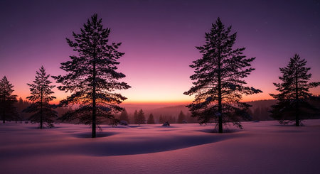Serene winter landscape featuring snow-covered pine trees, a starry night sky, and a distant mountain range at dusk, with a gradient of blue, pink, and orange hues.