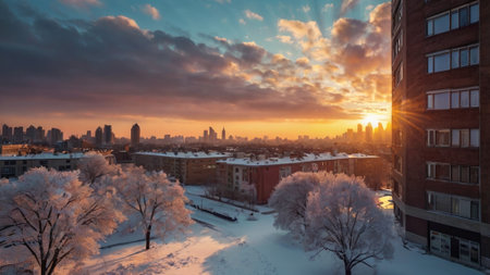 Winter sunset in the city. Beautiful winter landscape with snowdrifts.