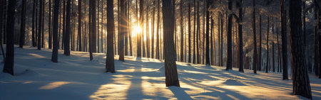 Sunbeams illuminate a panoramic winter forest scene, casting long shadows on the snow.