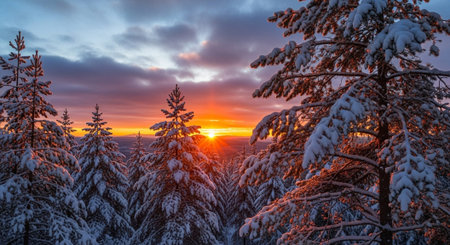 Experience the tranquility of a winter sunset illuminating a snowy landscape. Majestic evergreen trees stand proud against a colorful sky, inviting peace.