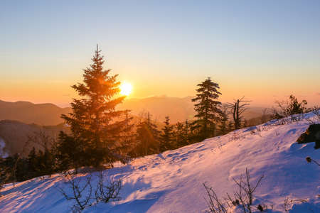Beautiful winter landscape. The sun sets below the horizon against the backdrop of powdered winter trees atop a snowy mountain