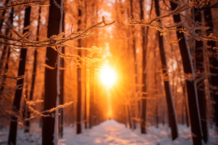 Beautiful sunrise in the forest after snow