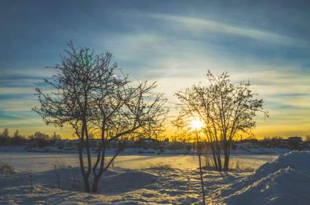Sunrise or sunset in a winter field covered with snow and with trees and grass covered with frost. Vintage film aesthetic.