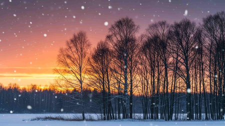 A peaceful winter scene featuring a line of bare trees, snow-covered ground, and a breathtaking sunset with warm orange and pink hues, accompanied by gently falling snowflakes.