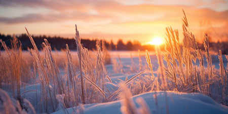 An AI illustration of a scenic field of grass covered in frost illuminated by the setting sun