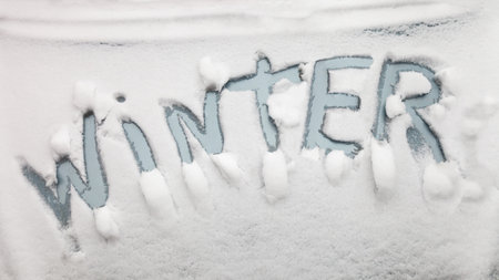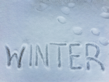 Word WINTER written in the frozen snow in winter season. Concept of cold snowy weather forecast. Freezing climate change natural disaster challenging