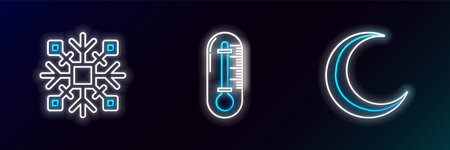 Set line Moon and stars, Snowflake and Thermometer icon. Glowing neon. Vector