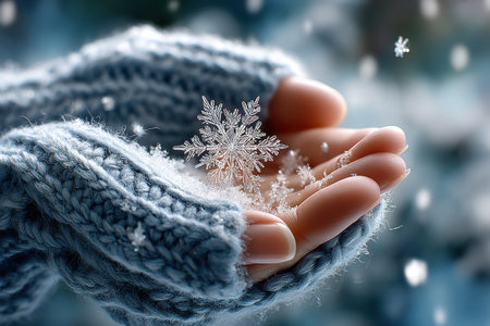 Two hands in blue mittens hold a delicate snowflake amidst falling snow