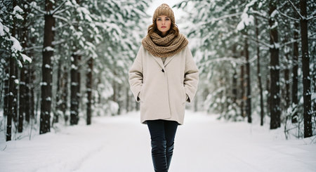 Portrait of a beautiful young woman in a beige coat walking in the winter forest.