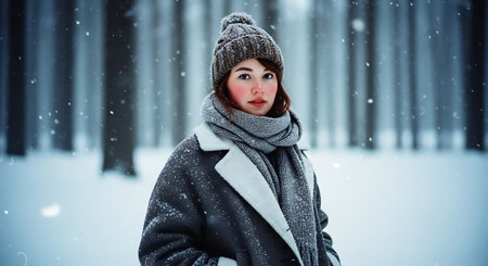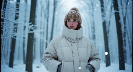 A young woman in a warm, oversized winter coat and knitted hat standing in a snowy forest, surrounded by tall trees, with snowflakes gently falling around her