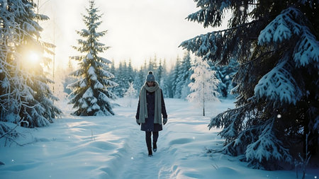 Woman walking in snowy winter forest