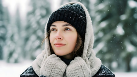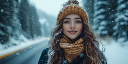 A young woman stands on a snowy road surrounded by tall trees smiling with joy as flakes fall softly around her. She wears a warm hat and a cozy scarf embracing the winter beauty.