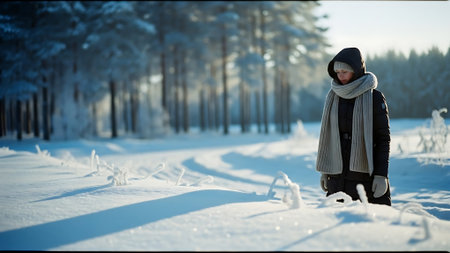 A serene winter scene depicting a woman in a cozy beanie and scarf, gazing at a snowy forest landscape, evoking feelings of tranquility and exploration.