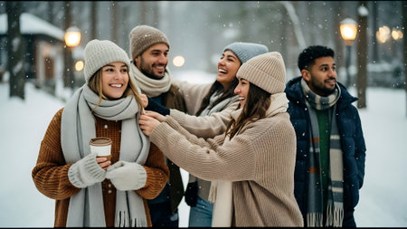 Group of friends walking in the city at winter time. Concept of friendship and happiness.