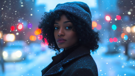 A young woman in a black winter coat and beanie, standing in a snowy landscape with falling snowflakes, looking thoughtfully into the distance