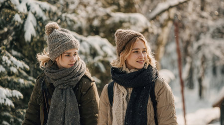 Two young women enjoying a snowy winter day outdoors.