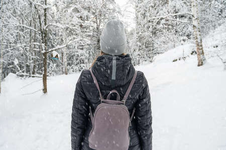 Woman wearing hat and warm jacket standing on a background of snowy forest. View from the back.