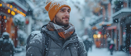 Portrait of a handsome young man in winter clothes laughing outdoors.