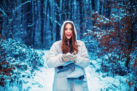 Young blond beautiful female with white ice skates in her hand in winter snowy forest.