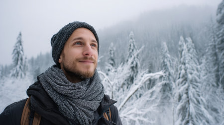Portrait of a young man in a winter forest with snow.