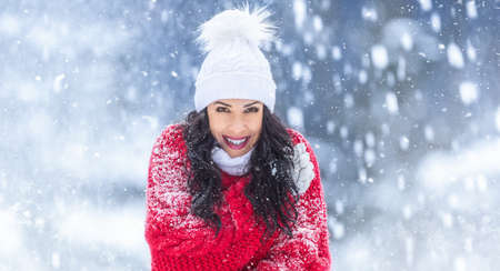 Portrait of girl in snow trying to warm herself. Winter woman happy. Sensual brunette winter girl posing and having fun.