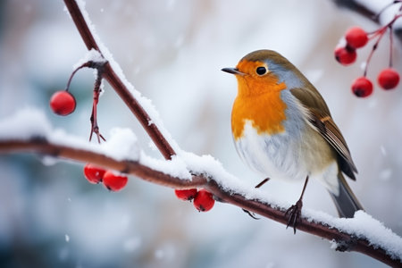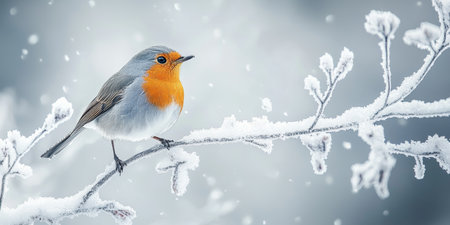 A Beautiful Winter Scene Featuring a Robin Perched on a Snow-Covered Branch in Nature