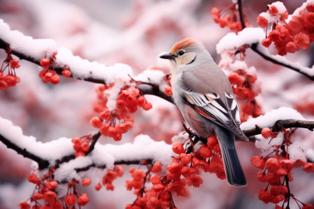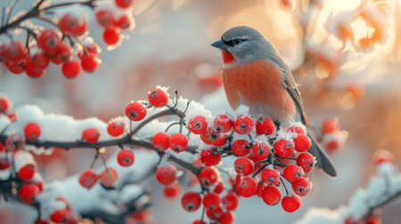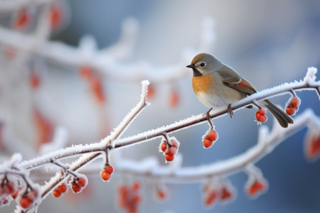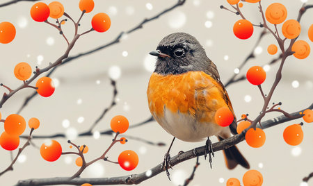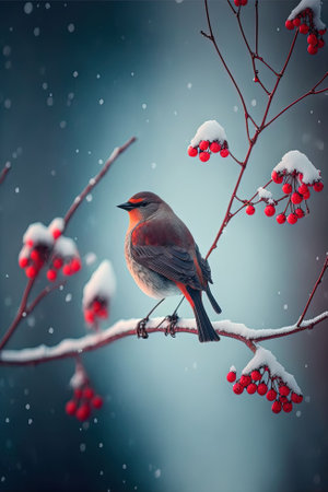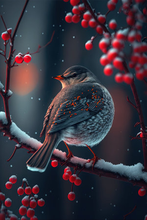 An AI generated illustration of an adorable bird perched on a cold winter tree branch, surrounded by bright red berries