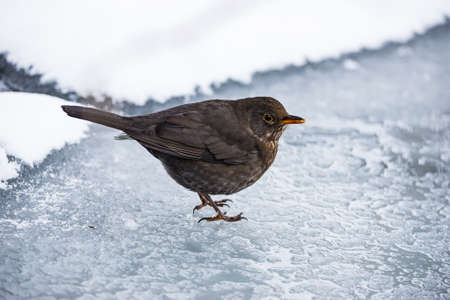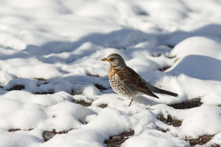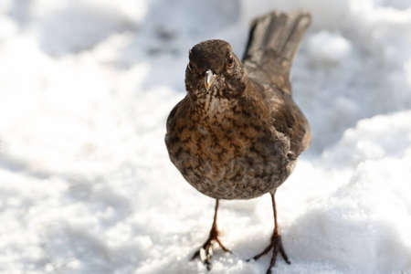 Closeup of a song thrush bird, Turdus philomelos, foraging in snow, beautiful cold Winter setting