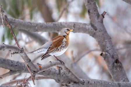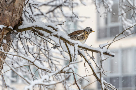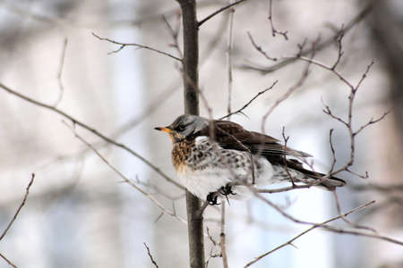 Turdus philomelos. Fieldfare bird sitting on a branch in winter.