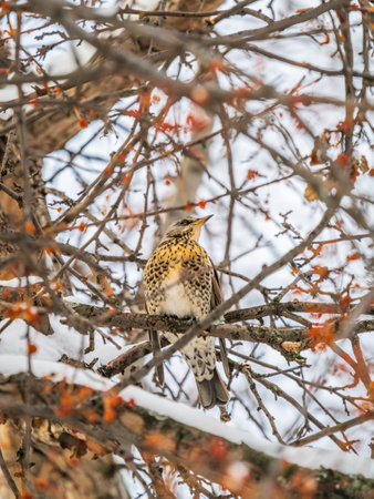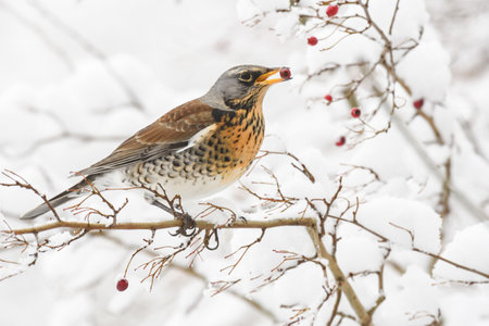 Fieldfare (Turdus pilaris) a medium-sized migratory bird, a colorful bird sits between snow-covered branches and eats red fruits on a winter day.