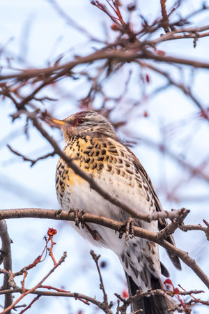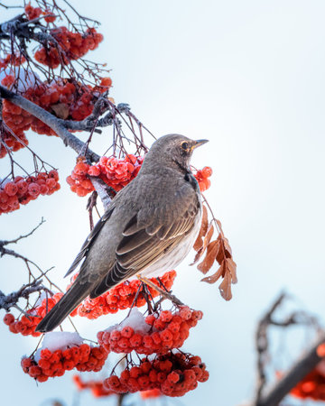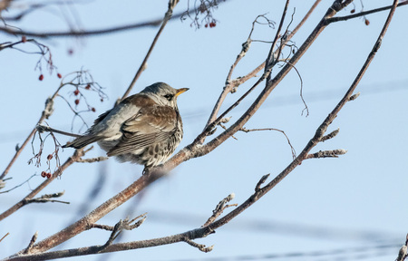 Fieldfare on a branch of mountain ash Sorbus in winter