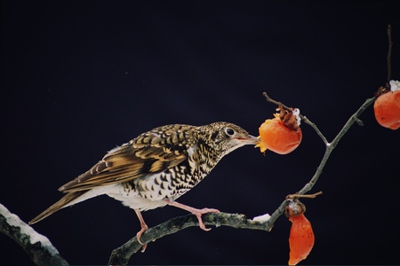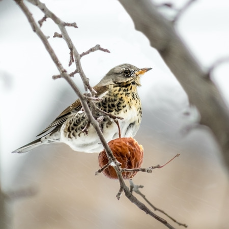Fieldfare (Turdus pilaris) regales apple in a snowstorm
