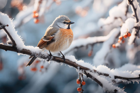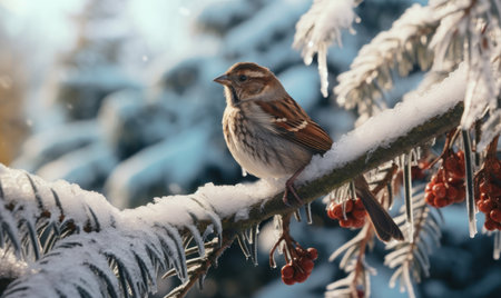 Generative AI Image of Sparrow Bird Perched on Tree Twig with Berries in Snow Season