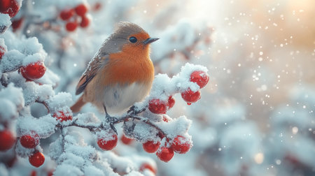Enchanting winter forest scene red berries and sparrow amidst snowy landscape with text space