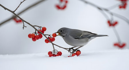 A small gray bird perches on a branch to eat bright red berries against a snowy winter background. The image captures a moment of wildlife survival and nature's contrast during the cold season.