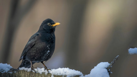 A male common blackbird with a vibrant yellow beak is perched on a snow-covered branch. The background is blurred, showcasing a muted winter landscape.
