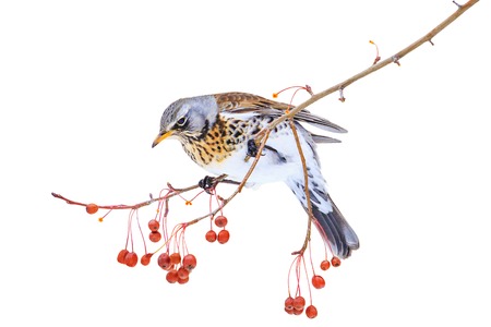 beautiful bird and red berries are isolated on a white background , changing the season, wild birds survive in the cold