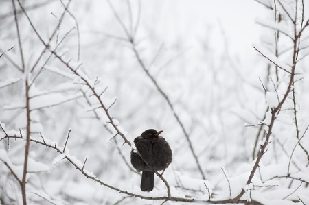 Blackbird sitting on a branch covered with hoarfrost in winter forest