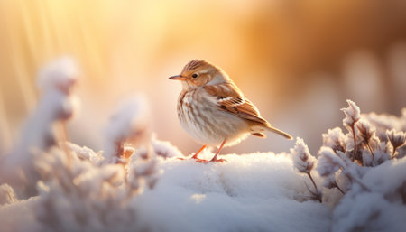 A serene bird sits gracefully on a snowy branch, illuminated by the soft light of a winter sunrise. The frost-covered environment creates a peaceful scene of nature's beauty.