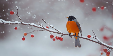 A Beautiful American Robin Sitting Gracefully on a Snow-Covered Branch in a Winter Wonderland Scene