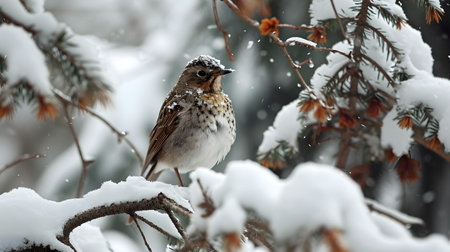 A small thrush bird rests on a snow-covered pine branch in the winter. Snowflakes gently fall around it.