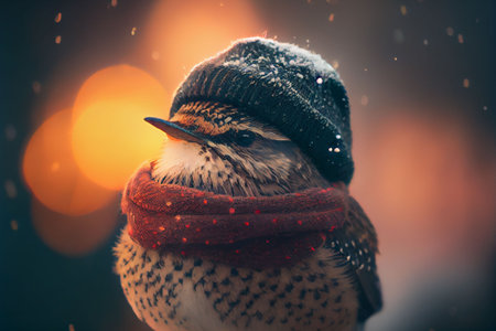 An AI generated illustration of a small bird wearing a knitted hat under the snow