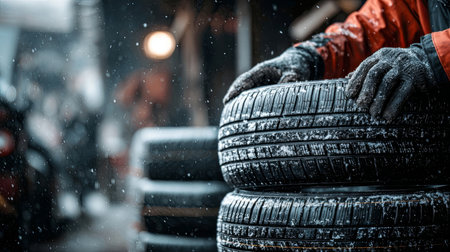 A dedicated worker handles fresh tires in a snowy tire shop, showcasing craftsmanship and attention to detail amidst a wintry backdrop.