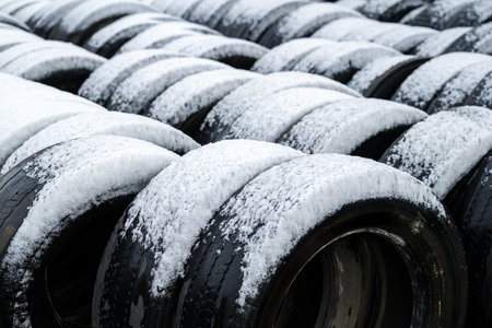 Stack of old used bus vehicle tires covered in winter snow, selective focus