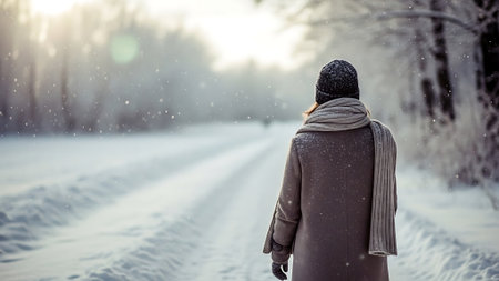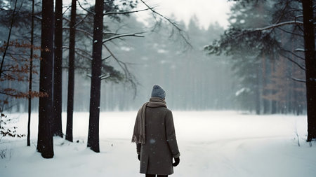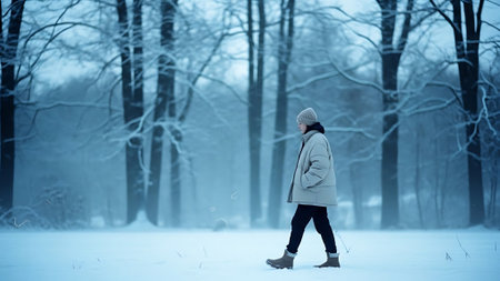 A woman walking along a snowy path in a winter landscape, surrounded by trees, wearing a warm coat and scarf, with a foggy atmosphere