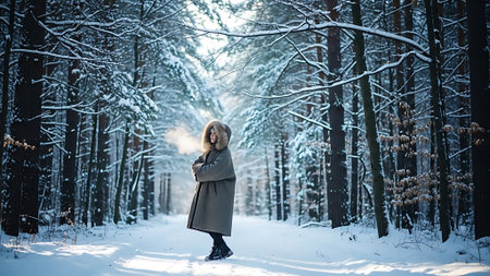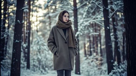 A young woman in a long coat walks in the winter forest.