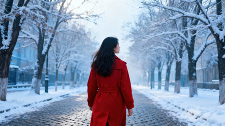 Rear view of a brunette female wearing a vibrant red coat walking along a symmetrical cobblestone path contrasting sharply with the white snow and frosty trees lining the avenue.